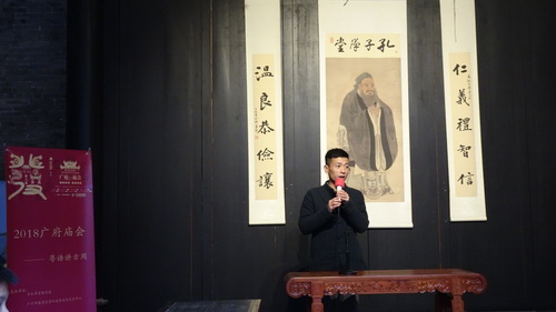 活动一开始,青少年讲古工作坊授课老师、粤语讲古传承人彭嘉志先生请出了他的两位得意门生为这次活动打响头炮。两位小师兄穿着长衫,手摇纸扇,抑扬顿挫,声音时而宏亮时而轻声细语,配以生动的神态和动作,让在座的听众听得甚是入神,发出会心的笑声。