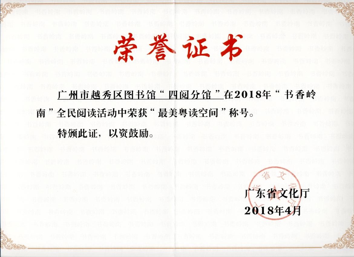 越秀区图书馆四阅分馆,一年365天,天天开放,被网友誉为“广州最美的图书馆”,是越秀区图书馆与广东新华发行集团合作探索公共图书馆与实体书店网络化融合新模式的成功范例。分馆一经开放,反响热烈,得到广大市民的喜爱和媒体朋友的关注。广东电视珠江频道、广东电视新闻频道、广州电视台新闻频道G4报道、珠江在线《花城频道》、珠江在线《甜果时光》、南方日报、南方都市报、羊城晚报、新快报、广州日报、信息时报、中国文明网等新闻媒体争先报道。其特点有: