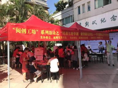 为庆祝中华人民共和国成立69周年,以习近平新时代中国特色社会主义思想为统领,深入贯彻落实党的十九大精神,加强爱国主义教育,坚定文化自信,培养广大读者良好的阅读习惯,促进文化惠民,2018年10月6日上午,“阅读喜迎华诞 聚创献礼国庆——国庆阅创嘉年华活动在高剑父纪念馆一楼广场拉开帷幕。当天蓝天白云,秋阳明媚,活动吸引了不少市民参加,很多市民还带着孩子一起参加。本次活动由越秀区图书馆主办,高剑父纪念馆协办,环悦艺术空间提供活动支持。