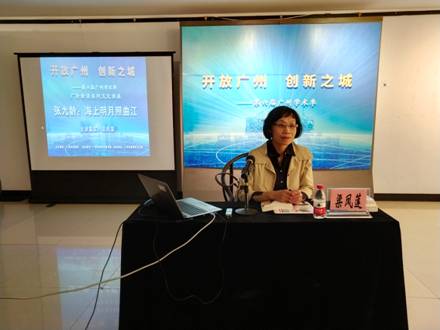 为贯彻党的十九大精神和习近平新时代中国特色社会主义思想,不断完善公共文化服务体系,促进文化惠民,进一步弘扬中华民族优秀传统文化,培育和弘扬社会主义核心价值观,坚定文化自信,2018年11月24日,梁凤莲研究员主讲的“广府新语”历史文化系列讲座——《张九龄:海上明月照曲江》讲座在广州市东湖路39号越秀区文化馆5楼水墨村举行,现场座无虚席。本次讲座由广州市社科联主办,越秀区图书馆承办。