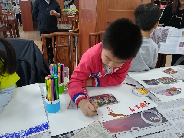 满满干货的广府文化科普之后,就到了小读者动手做庙会剪报的时间。老师给小读者派发了白纸,报纸,剪刀,双面胶,水彩笔等所需工具后,就轮到他们自己发挥动手能力和创造力去完成一份完美的剪报了!小小的手拿着大大的报纸,筛选着里面的内容,眼睛蹭亮蹭亮生怕错过了什么,然后用剪刀慢慢沿着边缘把需要的内容剪下来,贴在白纸上。制作的过程中,每个小读者都非常认真、专心,时间一分一秒地走,剪报也慢慢成形了。