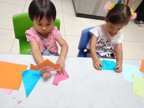 活动一开始,老师就以讲故事的形式来拉开本次活动的序幕,生动形象的小故事,加上老师幽默风趣的语言,在场的小读者们瞬间被吸引了注意力,专心致志的听老师讲故事,了解到“纸”是中国四大发明之一,折纸在中国民间广为流传,它同剪纸、刺绣、风筝制作一样,是世代相传的民间艺术,它是造纸术诞生以后,我国劳动人民在生活中创造出来的。我国劳动人民在日常生活中,创造了许多形象逼真的折纸作品,如裤子、花篮、宝塔、鹤、船等;同时,纸的折叠技艺被广泛应用在日常生活中,如扇子、雨伞、灯笼等。中国民间艺人仅凭一张小小的纸,即可将花鸟鱼虫衣裤鞋帽瞬间“变”出来。