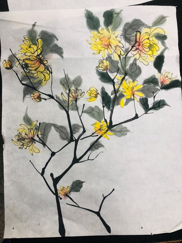 课堂上,胡老师认真给大家讲解了菊花的生长特点,及绘画的注意问题,现场示范画枝画叶画花技巧,细心讲解枝节表