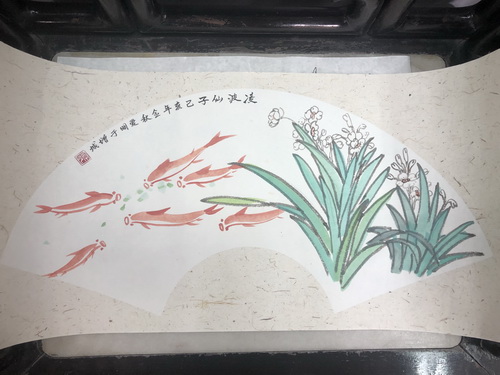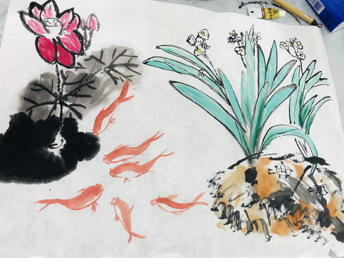 活动邀请了画家、艺术评论家,广东省美术评论学会副秘书长、高剑父纪念馆馆长助理:胡爱明老师,现场挥毫和示范如何画水仙。课堂上,胡老师给大家讲解了人们爱水仙,颂水仙,画水仙的不了情结。讲解画水仙的花叶、根部的表现方法。胡老师现场示范画花叶和根,如何注意正侧翻转、疏密布置、长短变化等问题。在大家都掌握了画水仙的技巧后,胡老师接着把如何画小鱼的技法也传授给各位读者。胡老师提按和腕转,点画配合,几笔便把活灵活现的小红鱼展现在大家的眼前,整幅画作就显得更加有层次。