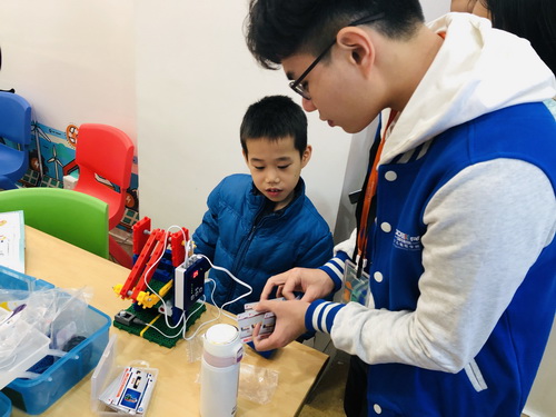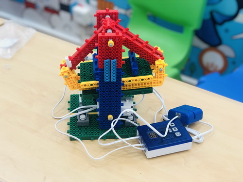 最后,就是输入指定的编程程序时间,老师详细地给小读者讲述如何将指令输入到组装好的海盗船,通过对应的卡片组合编程指令,这艘海盗船实现了上下高速运转了哦!小读者们兴奋极了,对自己的成果感到非常满足!