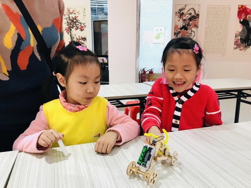 经过小创客们的不断尝试,再加上家长们的协助,小创客们的伸缩机器人完成了!让我们欣赏它们的表演吧,看看谁的伸缩机器人行走得最流畅。