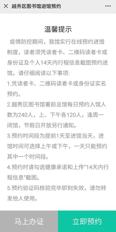 读者未办理读者卡,则无法预约。读者可先从微信公众号进入预约系统,在“温馨提示”界面点击“马上办证”提交个人信息办理读者卡,再进行预约。如已办理读者卡,点击“立即预约”即可。