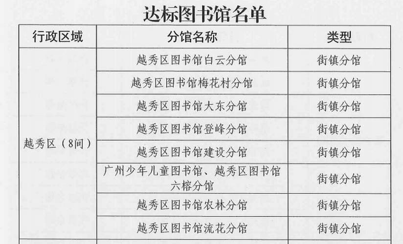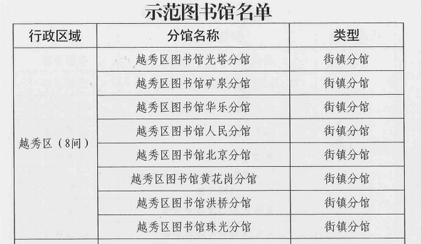 越秀区图书馆大力推进总分馆服务体系建设,与街道、社区、学校、书店、企业等共建分馆,让老百姓畅享“阅读就在家门口”的获得感和幸福感。建成总馆1个、专业性分馆1个(越秀区少年儿童图书馆)、街镇图书馆16个(其中全市示范馆8个,与社会力量共建的2个)、特色分馆2个(其中与社会力量共建的2个)、社区分馆7个(其中与社会力量共建的4个),24小时自助图书馆3个(其中与社会力量共建的1个)。越秀区图书馆四阅分馆获评广东十大“最美粤读空间”,越秀区图书馆光塔分馆获评“最美少儿阅读空间”,越秀区图书馆矿泉分馆获评“最美校园阅读空间”称号。