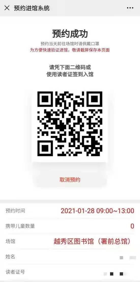 读者可扫码关注“广州市越秀区图书馆”微信公众号,通过“服务”栏目进入“预约进馆”平台或者直接扫描“预约二维码”进行预约。