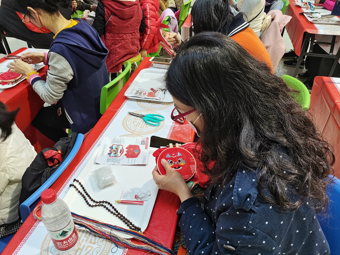 那么,广东醒狮与粤绣能不能强强联合,产生美妙的化学反应呢?老师肯定地告诉大家:可以!它们相结合,就可以成为限量版醒狮刺绣挂饰,寓意如意吉祥!在老师和志愿者们的辅导与陪伴下,读者朋友们开始DIY醒狮刺绣挂饰。不少读者是第一次DIY刺绣作品,但看得出来,大家都很热爱刺绣,因此上手很快,不一会儿的功夫就已经掌握了最基本的刺绣针法。