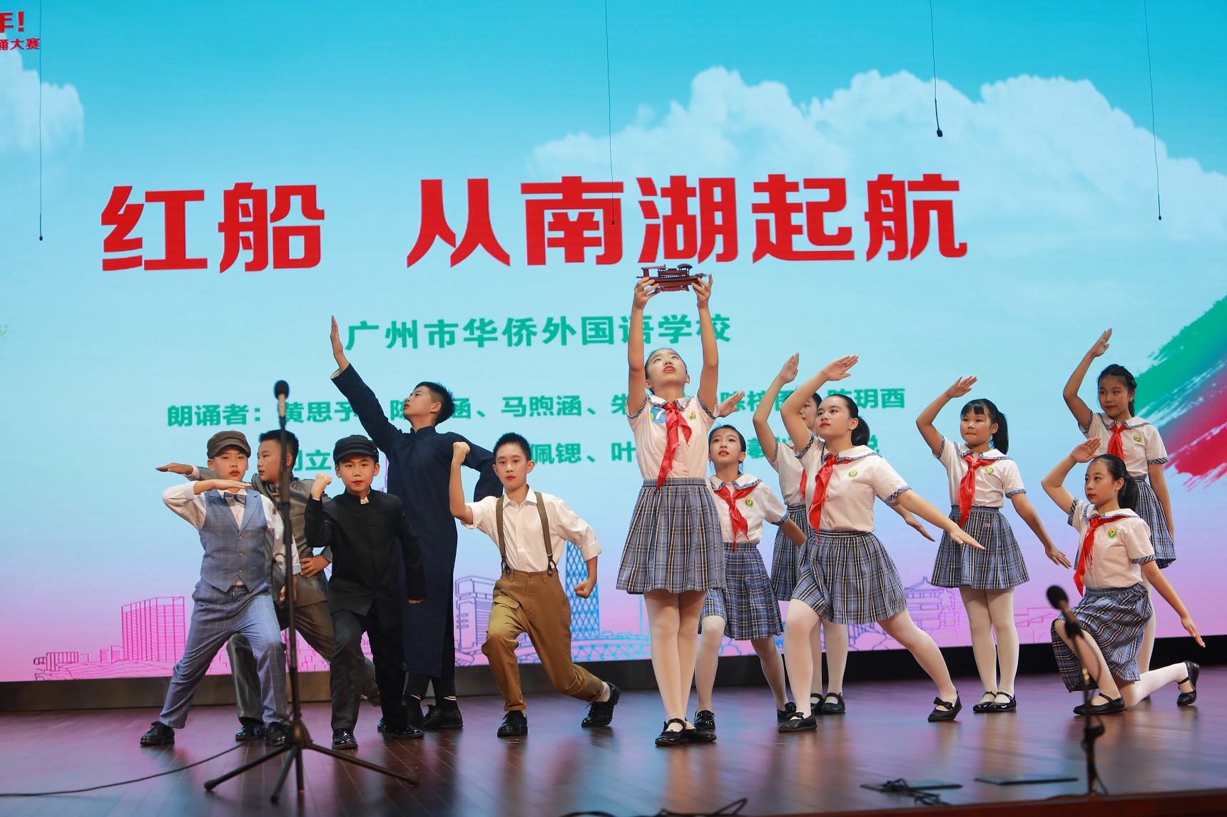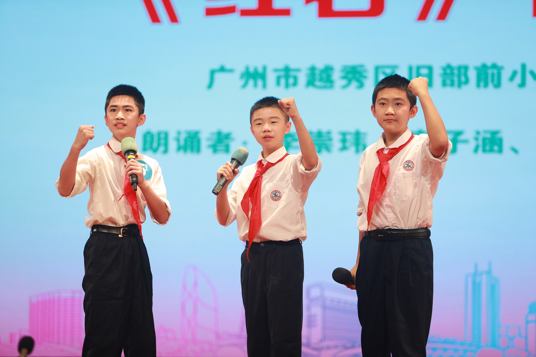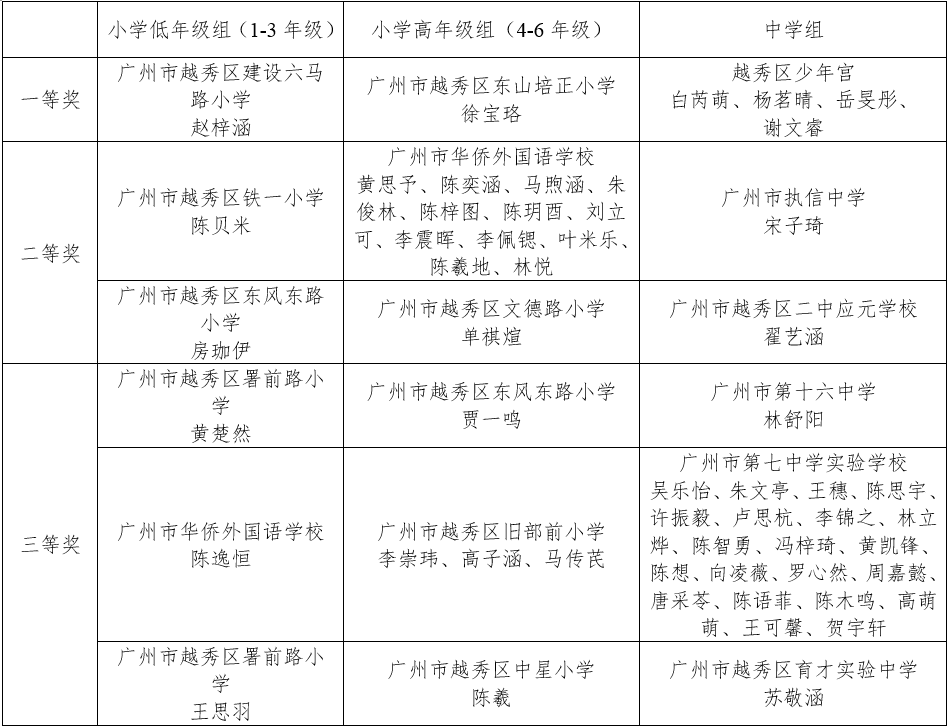 最终,由广州市越秀区建设六马路小学的赵梓涵同学、广州市越秀区东山培正小学的徐宝珞同学、越秀区少年宫的白芮萌、杨茗晴、岳旻彤、谢文睿组合分获各年龄段的一等奖,成为越秀区第三届青少年朗诵大赛中最闪亮的“红色朗诵小达人”。