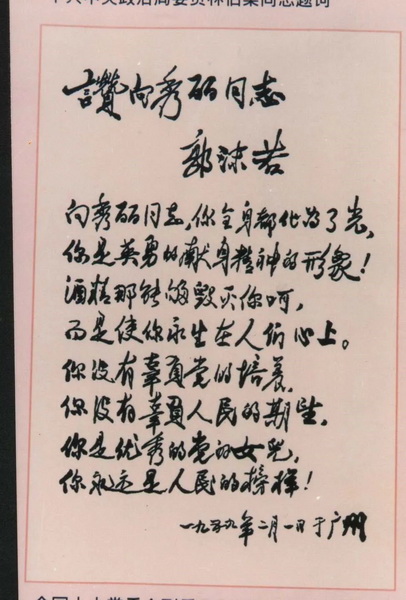 (图为郭沫若给向秀丽的题词。图片来源:广州市银河烈士陵园微信公众号)