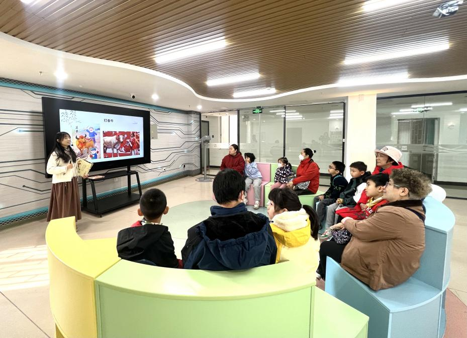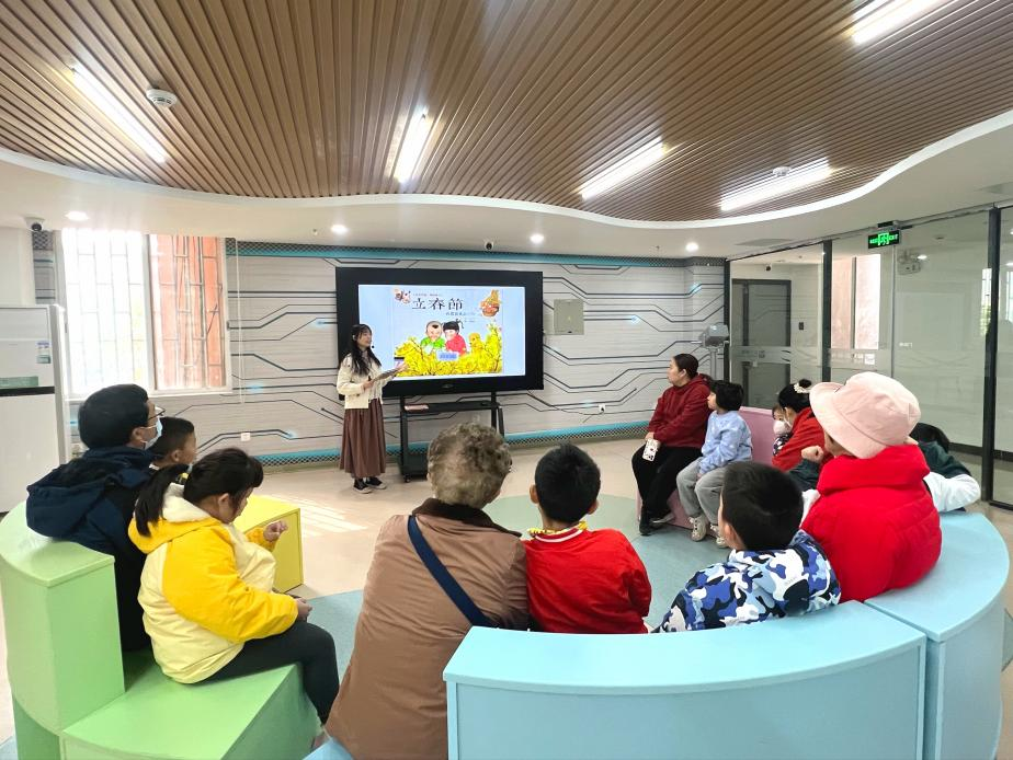 活动伊始,主讲老师通过分享绘本《中国记忆·立春节》并结合提问的方式,循循善诱地给小读者们介绍了立春的寓意、气候特点和风俗习惯,如:打春牛、咬春、吃春饼以及晒谷等,让现场的小读者们对立春节气有了更深入的了解。
