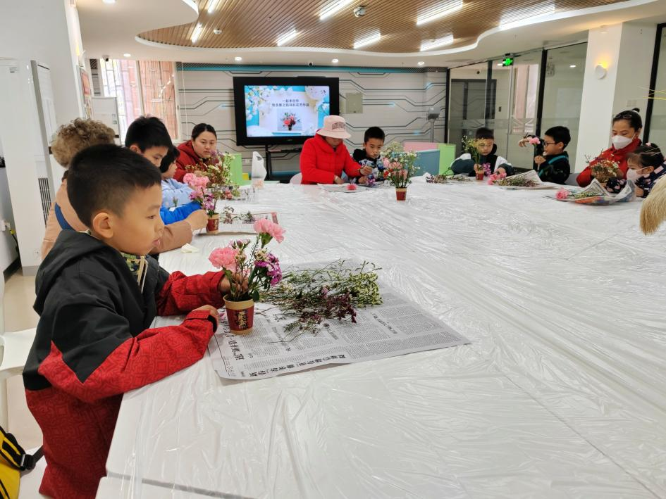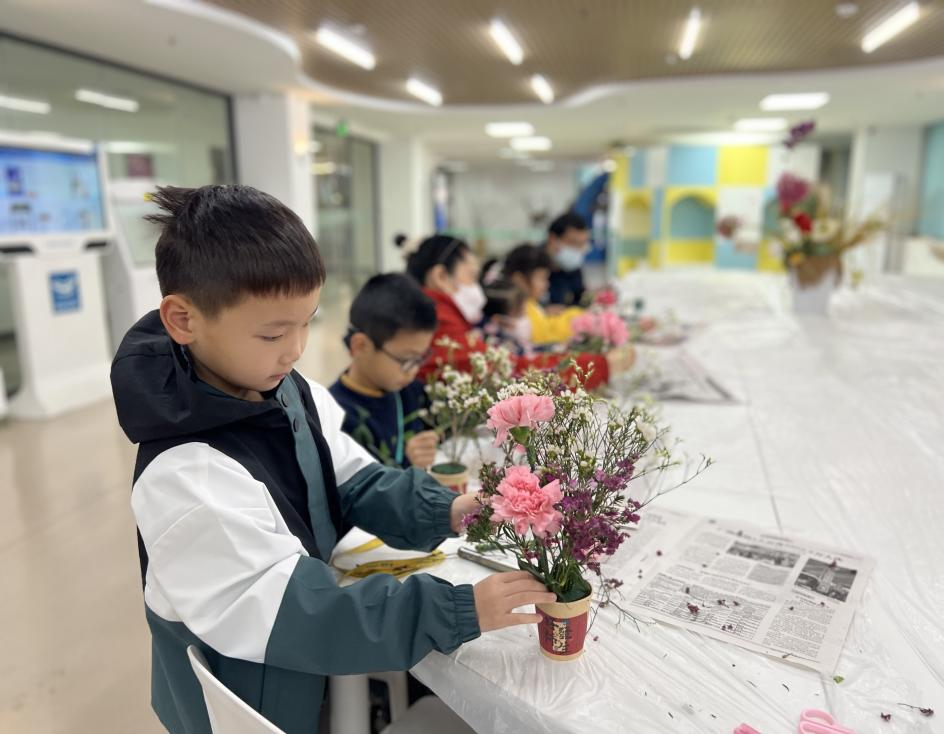 活动的最后,小读者们纷纷化身花艺师与家长一起制作花艺作品,亲身体验广州人爱花成性、赏花成风的美好民俗。在老师们的耐心指导下,小读者们手持剪刀,精心修剪、细心搭配,将自己对“花”文化的理解融入作品创作中。现场欢声笑语不断,大家互相分享着创作灵感,温馨的氛围弥漫在整个活动空间。