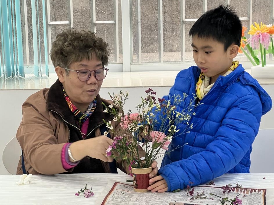 经过一番精心设计,一件件独具匠心的花艺作品呈现在眼前,有的用高低错落的层次感展现着春天的蓬勃生机,有的用简约的造型诠释着春日的清新雅致。这些作品不仅是对花卉之美的礼赞,更是小读者们对“广府年味”的具象表达。