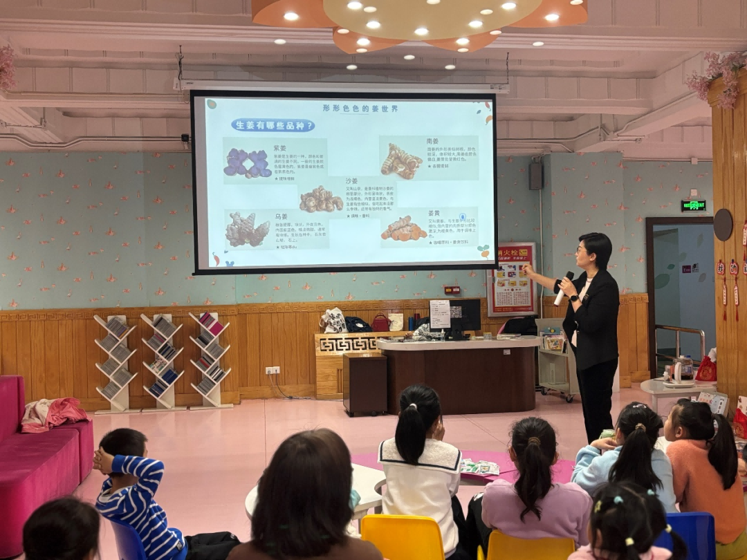 课堂里刘宇老师为大家准备了谜语、讲了关于生姜的故事,向小读者和家长科普了生姜的分类区别、药用价值、日常使用。还介绍了老广感兴趣的生姜特色菜谱:姜撞奶和猪脚姜。生姜在不同季节有不同的养生吃法,如夏季喝姜茶可祛湿,冬季吃姜可驱寒保暖。生姜除了日常当调味料还可以与不同食材搭配出不同的养生饮品,如:红糖姜茶、可乐姜茶、蜂蜜姜茶。现场观众听得津津有味,食指大动,现场充满欢声笑语,不时掌声雷动。