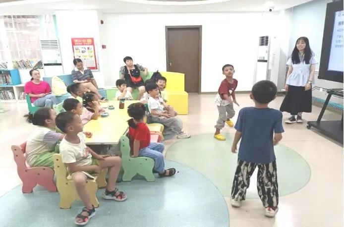 最后进行的“运动口令接龙”游戏,更是将欢乐的氛围推向了顶点。馆员说出“跑步”等全运会项目,读者们迅速反应,快速接上“前后摆臂”等对应动作,现场充满了欢声笑语。在这个过程中,读者们的记忆力和身体灵活性得到了很好的锻炼,同时对运动员的奋斗精神、坚强意志、爱国精神有了更加深刻的理解。