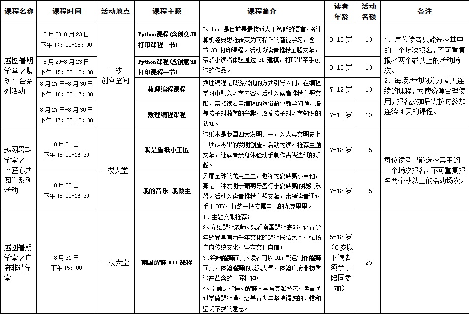 报名对象为本馆读者;本次暑期学堂活动预留部分学位安排区内低收入困难家庭、残障人士、环卫务工