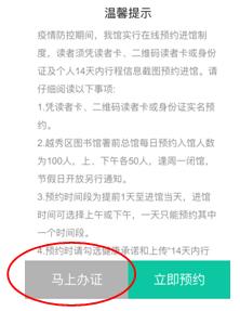 读者未办理读者卡,则无法预约。请先在预约平台“温馨提示”界面点击“马上办证”提交个人信息办理读者卡,再进行预约。如已办理读者卡,点击“立即预约”即可。
