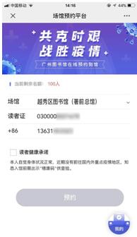 选择要预约的场馆(请选越秀区图书馆署前总馆);输入读者证号;输入手机号码并验证;根据自身情况,勾选健康承诺。点击“预约”进入下一步。