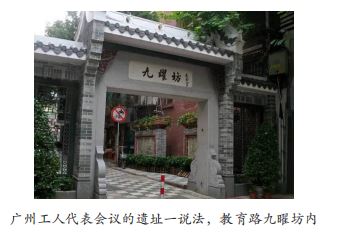 广州工人代表会议的遗址现在说法不一,具体来说,有两个争议地点,一为教育路九曜坊内,二为教育路80号南方剧院所在地。由于广州工人代表会议存在的时间不久——1925 年5月成立至1927年“四一五”政变遭重创;大革命失败后,工人代表遭到打击伤害;再加之,后来城市规划重新进行房屋建设,所以,时至今日,会议遗址所在仍存有较大争议,有待后人提供史料特别是照片原件的参考。